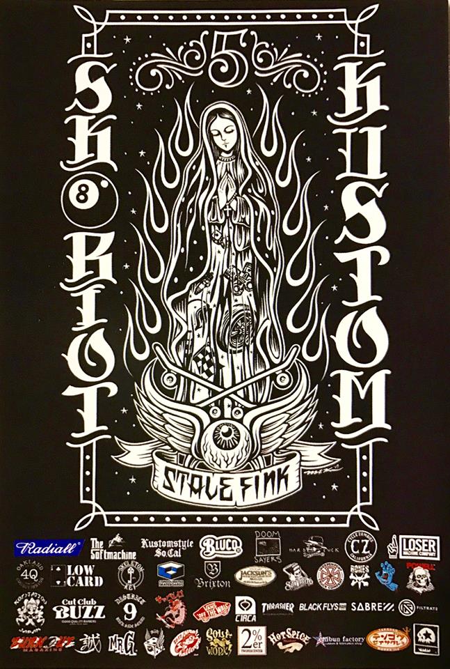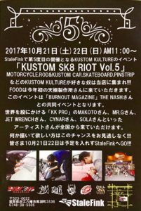 5th KUSTOM SK8 RIOT 2017年10月20日 12:02 pm 5th KUSTOM SK8 RIOT 10月21日(土)、22日(日)の2日間、滋賀県近江八幡市のStale Finkさんにて5th KUSTOM SK8 RIOTが開催されます。 M&Kもブースを出店させていただきます。… みなさん是非お誘い合わせの上、遊びにお越しください。 両日共イベント後半には豪華抽選会もあります。 5th KUSTOM SK8 RIOT 場所:Stale Fink 滋賀県近江八幡市馬淵町3536 0748-38-5505 日時:10月21日(土)22日(日)AM11:00~ Categorised in: what's new, M&Kblog, events written by M&K CUSTOM SIGNS <<前のページへ 次のページへ>>